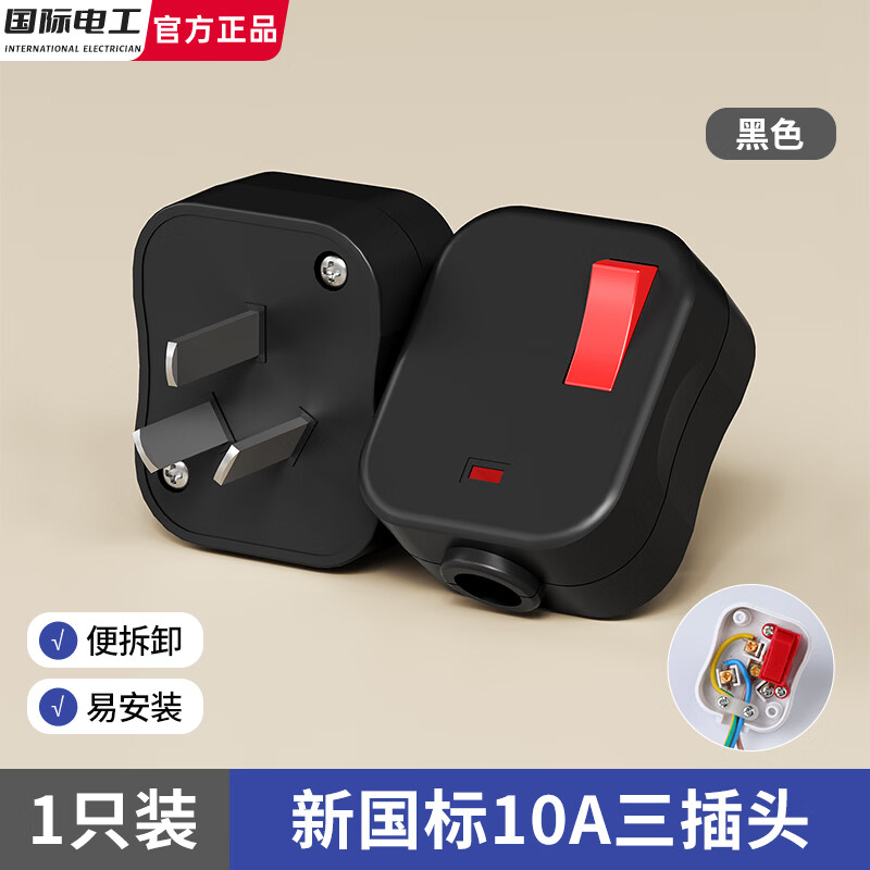 国际电工10A三脚接线电源带开关插头家用空调三孔3脚插接头一键断电可拆卸 10A三插头【黑色】带开关带灯
