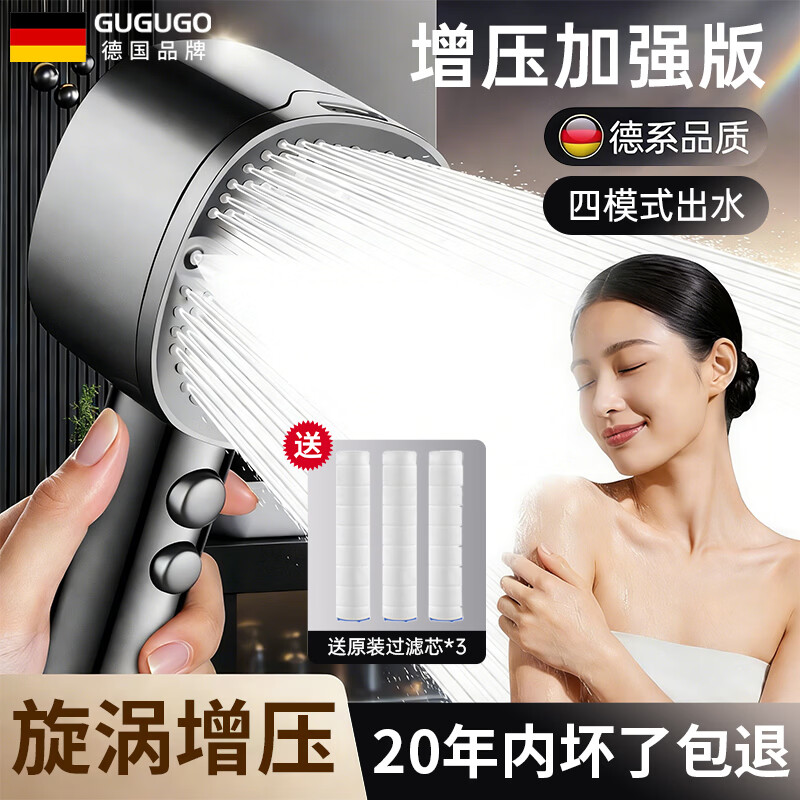 GuGuGo【德国】淋浴花洒喷头带软管一套浴室洗澡增压过滤手持淋浴花洒头 枪灰【涡轮四档增压】带3只滤芯 深层过滤杂质丨涡轮强劲增压