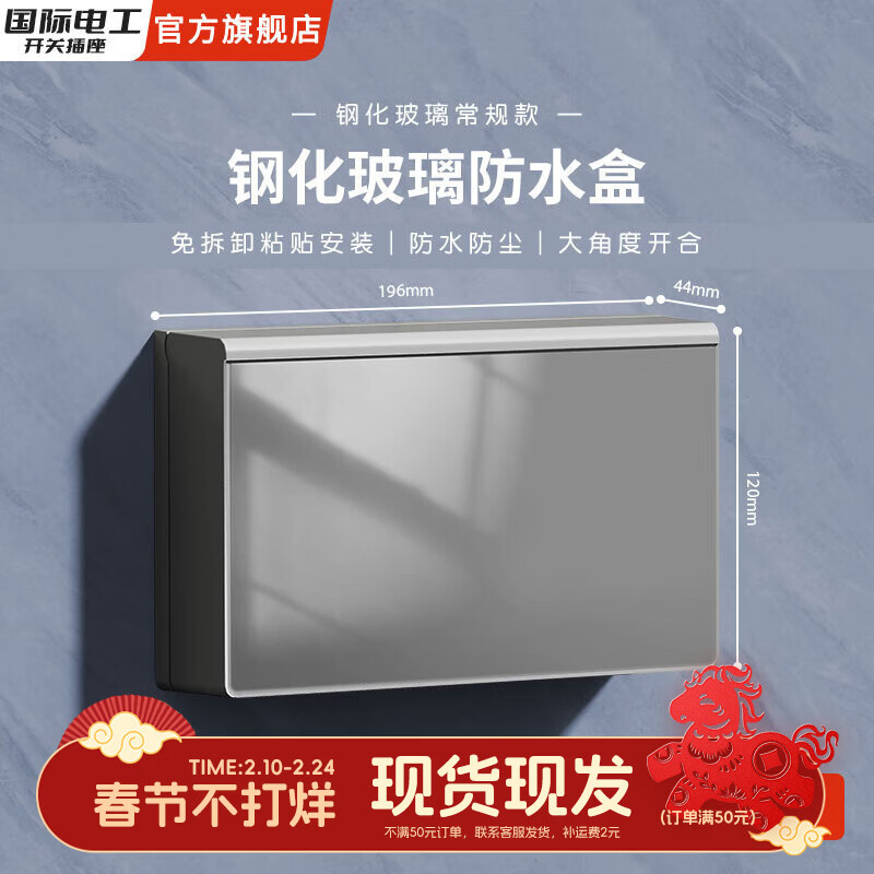 国际电工超薄钢化玻璃大理石纹理防水盒自粘免打孔二位防尘全网独家发布 常规二位防水盒-灰色镜面