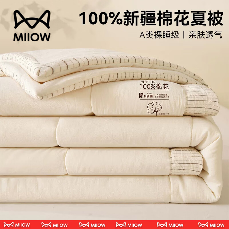 猫人(MiiOW)A类新疆棉花空调被夏凉被子夏季1.5米x2米夏被可机洗裸睡单人薄被 新疆棉-米白【A类可裸睡/100%棉花填充】 150x200cm-单人夏被【可水洗机洗】