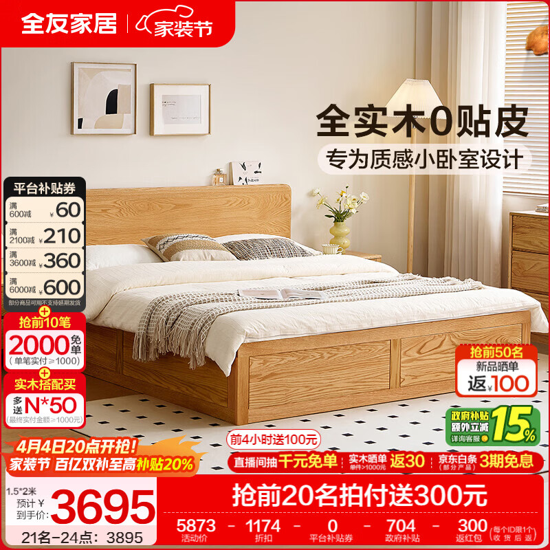 全友家居原木风储物床小户型家用齐边床主卧高端大气2026新款家具 【原木色 | 红橡木】储物床 1.5×2米