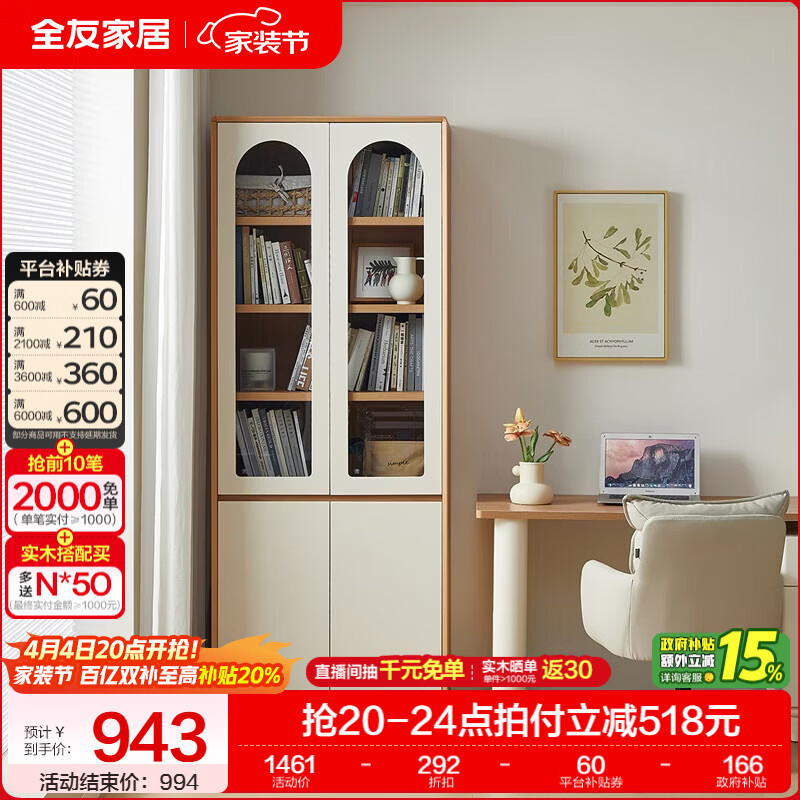 全友家居奶油风落地书架家用置物架收纳柜展示储物柜书柜一体靠墙客厅 0.8米x2.06米 | 双开门玻璃门款