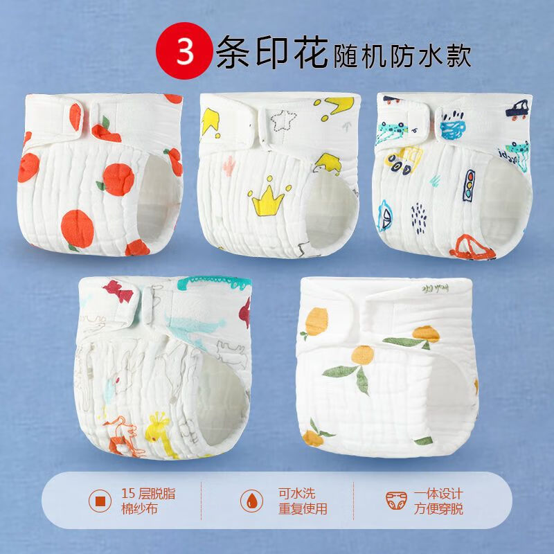 AILUKI尿布婴儿可洗纯棉新生儿宝宝专用秋冬全棉纱布尿戒子介子芥子尿片 M码【推荐0-8斤宝宝】 15层纯棉【一体尿布】印花防水款3条