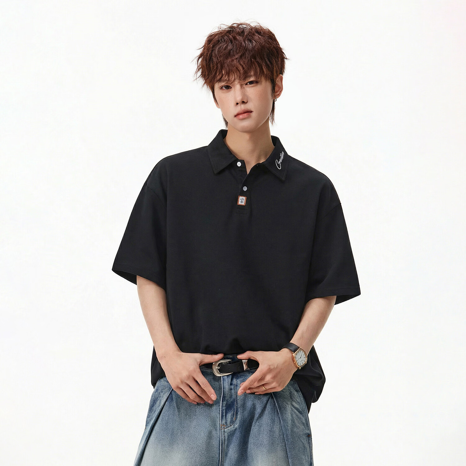 NEW OR MODE美式刺绣polo领短袖t恤男夏季新款宽松纯棉运动青少年半袖翻领T恤 黑色【高品质】 M 【建议90-110斤】