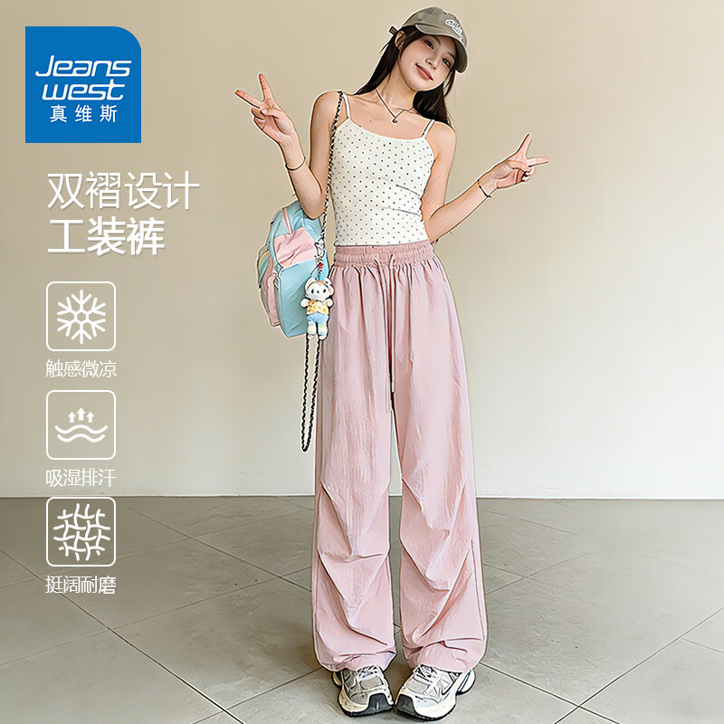 真维斯(Jeanswest)工装伞兵裤女春夏季学生休闲运动裤旅行登山冲锋裤户外阔腿速干裤 粉色 纯色 S