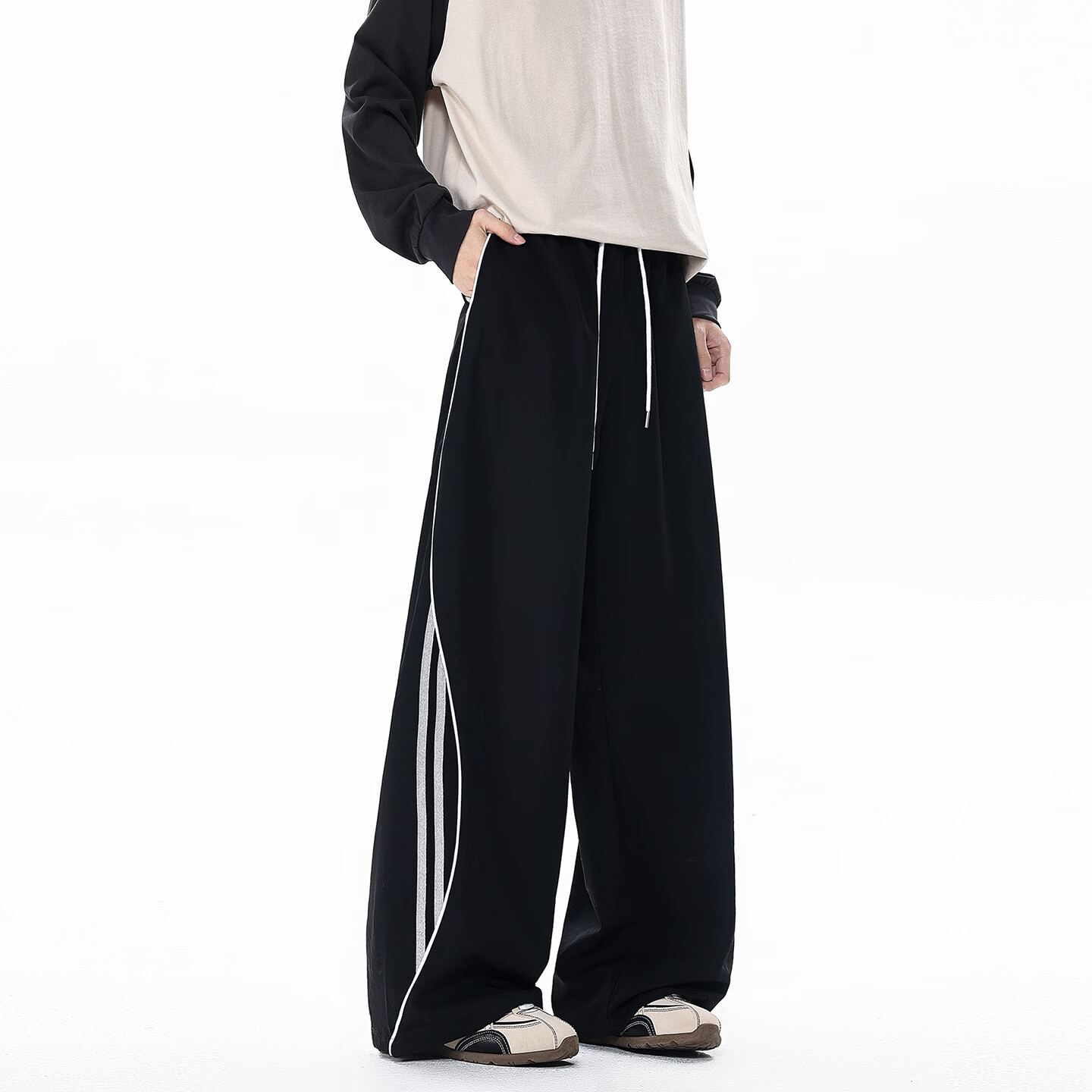 NEW OR MODE美式运动条纹休闲裤男夏季薄款透气垂感冰丝裤子百搭休闲阔腿长裤 黑色【高品质】 M 【建议90-110斤】