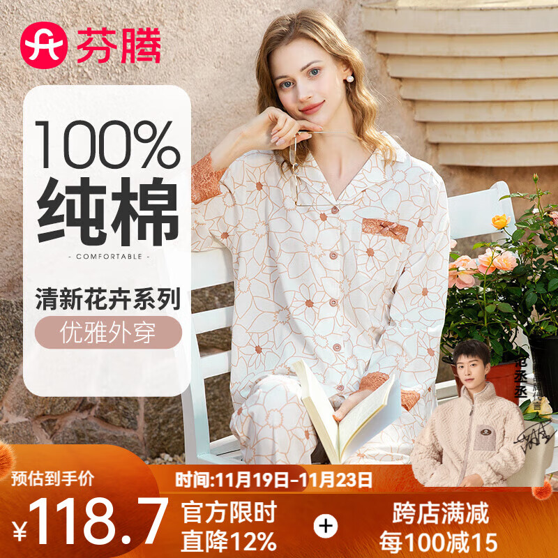 芬腾睡衣女季新款柔软纯棉优雅风翻领蕾丝长袖家居服套装 优雅白 M