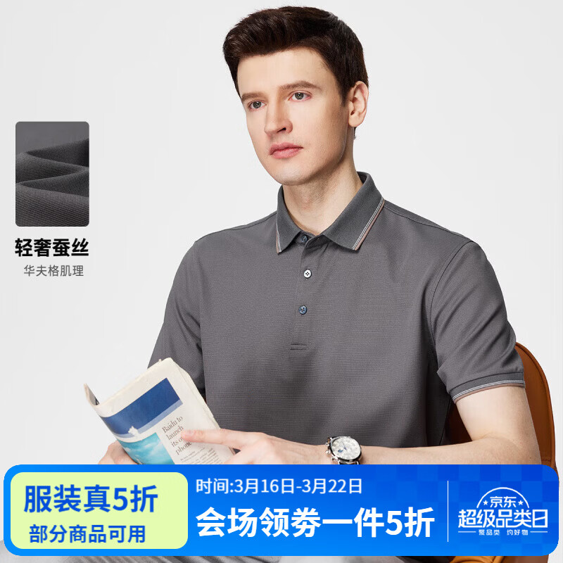杉杉(FIRS)【华夫格肌理】短袖T恤男夏蚕丝柔顺POLO领轻薄透气弹力休闲上衣 灰色 M 170/88A