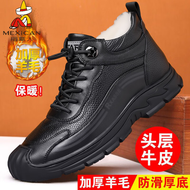 稻草人(MEXICAN)头层牛皮羊毛棉鞋男士冬季真皮加绒保暖皮鞋高帮鞋皮毛一体棉皮鞋 6019黑色【头层牛皮】质保三年 42
