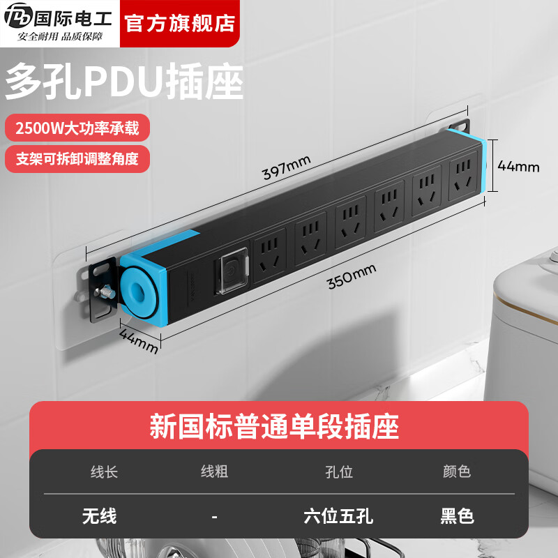 国际电工PDU机柜插座机房排插过载保护工程电源接线板家用桌下带线插线板 【普通单段】6位总控-无线(黑色)
