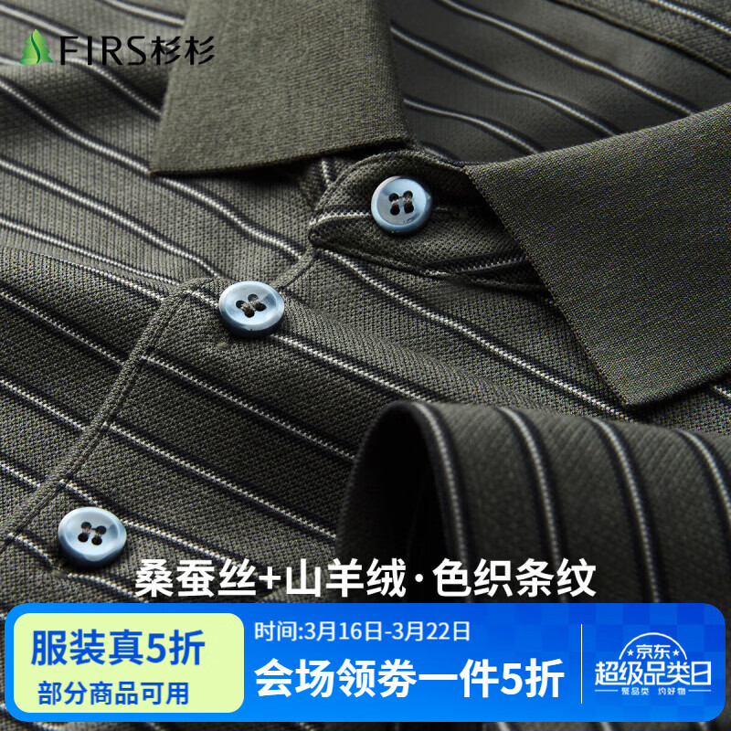 杉杉(FIRS)【蚕丝】短袖T恤男POLO领条纹休闲弹力顺滑亲肤柔软男装上衣 苔灰绿(宽条纹) M (170/88A)