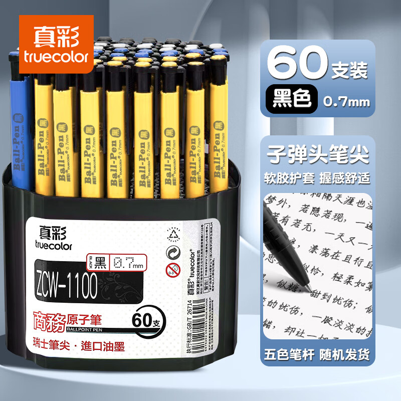 真彩(TRUECOLOR)0.7mm黑色圆珠笔按压式油笔圆珠笔老式经典原子笔多色中油园珠按动油性商务办公学生60支桶装1100A
