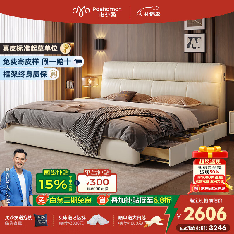 帕沙曼国货补贴真皮床极简落地床高端大气主卧大床双人1米8简约8353CP-R 【15CM钢木】单床+床垫#Z0012 1500*2000mm框架结构