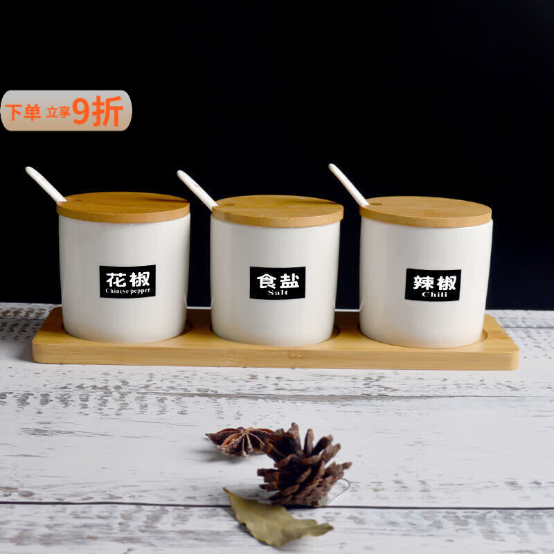 泰禧阁调味罐陶瓷盐罐厨房调料瓶罐子家用调味盐味精厨房调料盒组合套装 白色直身【三件套带木座】