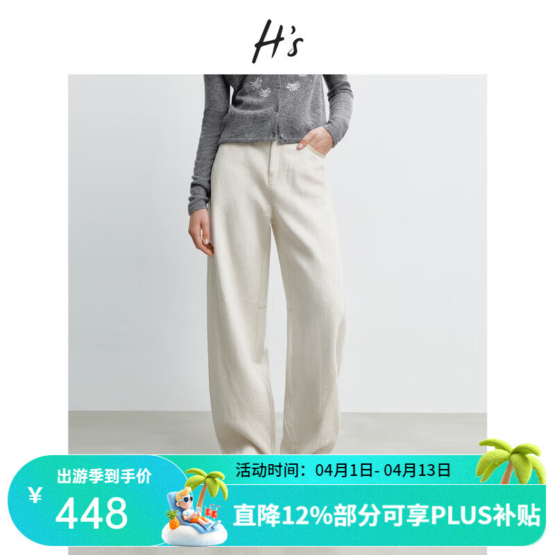 H's【莱赛尔】米白色牛仔裤女26年春季新款高级感含亚麻廓形弯刀裤 米白色 M