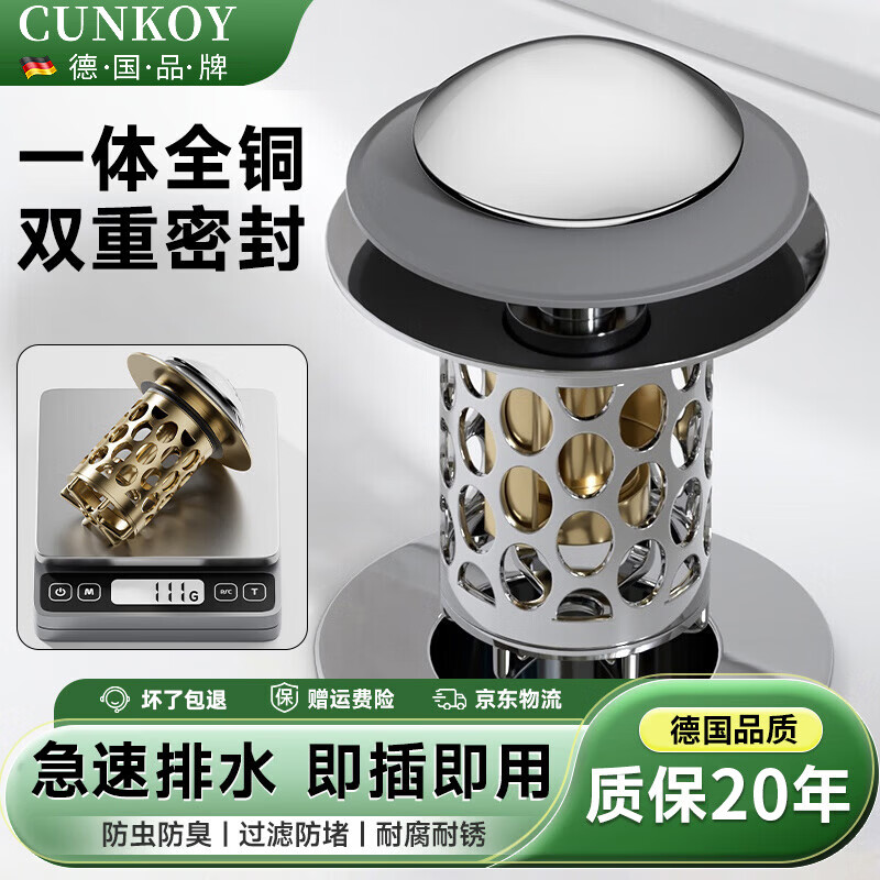 CUNKOY【德国】洗手盆漏水塞面盆弹跳芯全铜芯防虫防臭下水器防堵漏水塞 全铜面盆过滤防臭弹跳芯【升级不锈钢过滤网】 通用安装丨过滤防堵丨防臭防虫