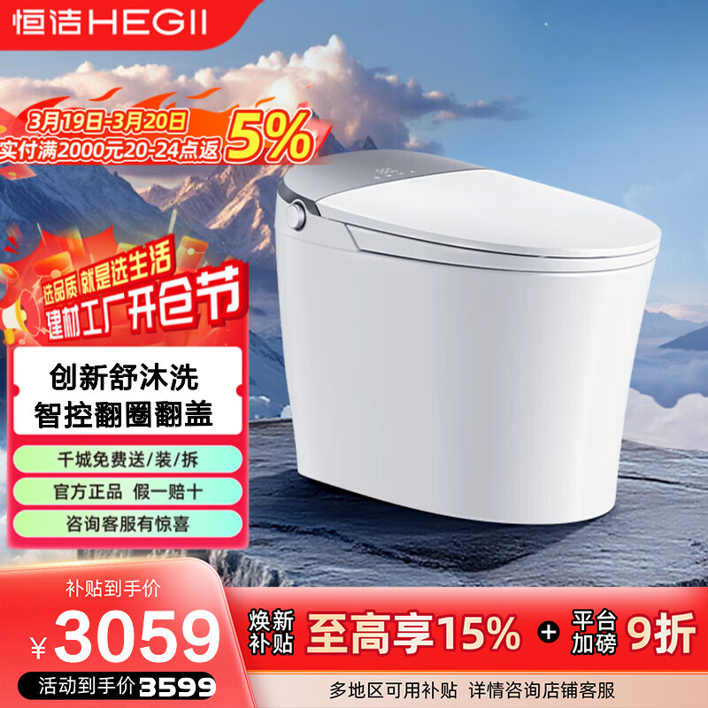 恒洁智能马桶一体机不限水压带水箱座圈加热随心贴翻盖翻圈坐便器HC5A 【舒沐洗随心贴翻盖翻圈】HC5A 305