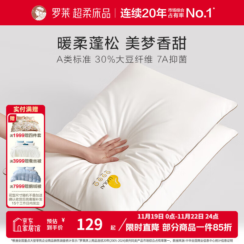 罗莱家纺 婚庆喜枕结婚对枕婚房枕芯新婚床上用品 A类全棉抗菌大豆枕 47*73cm 一对