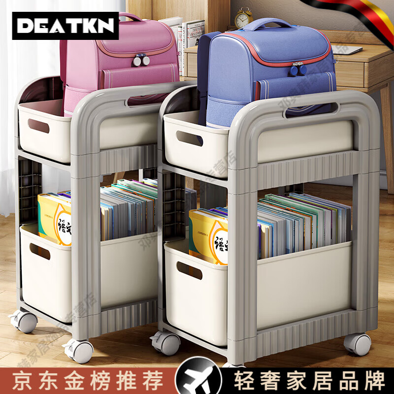 DEATKN德国书包置物架可移动小推车书本收纳架神器家用多层放书包桌下 灰白色-【1高+1矮】带轮可拆卸 2层