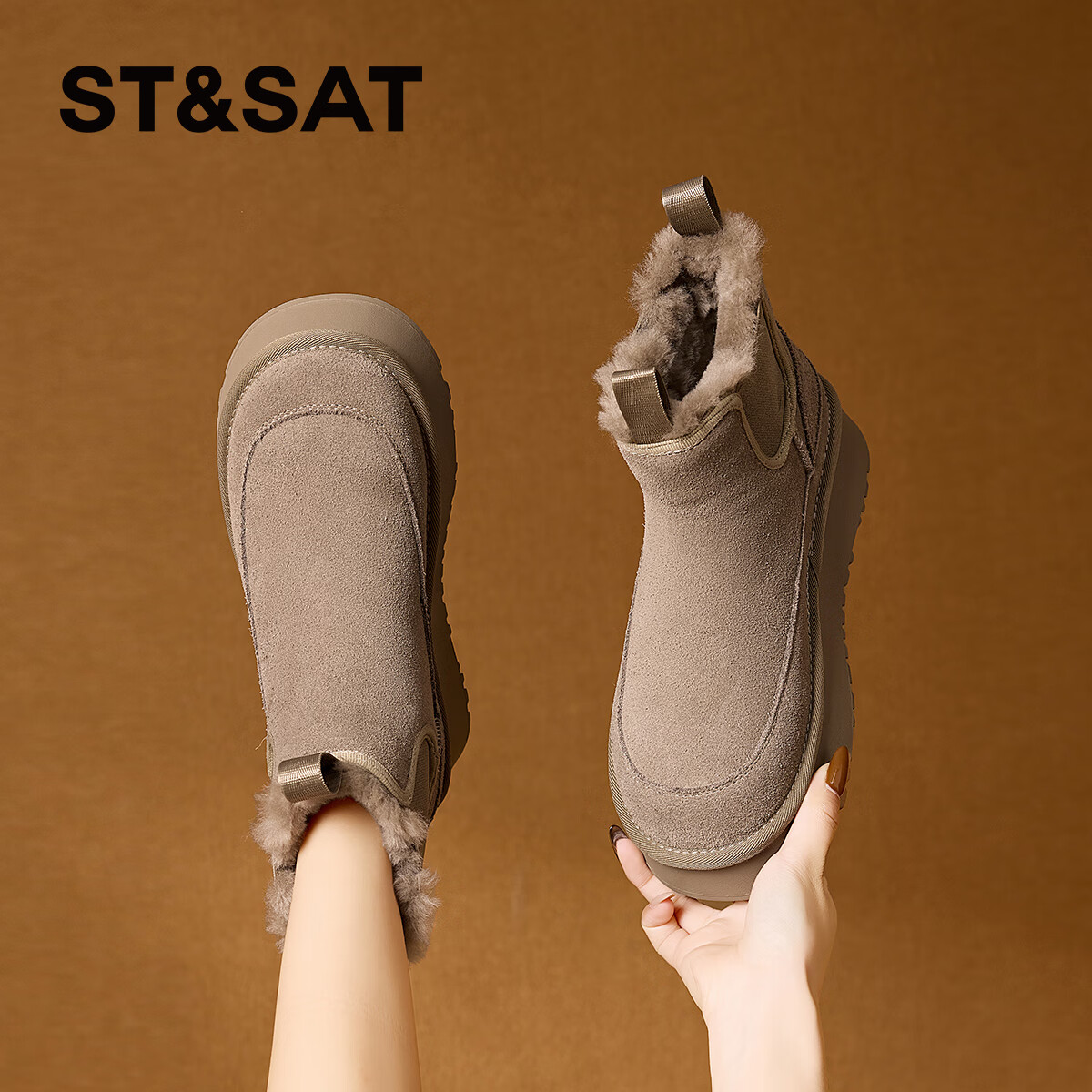星期六厚底雪地靴女2025新款秋冬加绒加厚保暖棉鞋女防滑皮毛一体短筒靴 卡其/绿 【上口兔毛-牛剖层皮革】 36