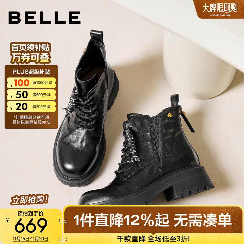 百丽(Belle)复古抓皱马丁靴女2025冬新商场同款真皮休闲短靴E8D1DDD5 黑色-单里 37