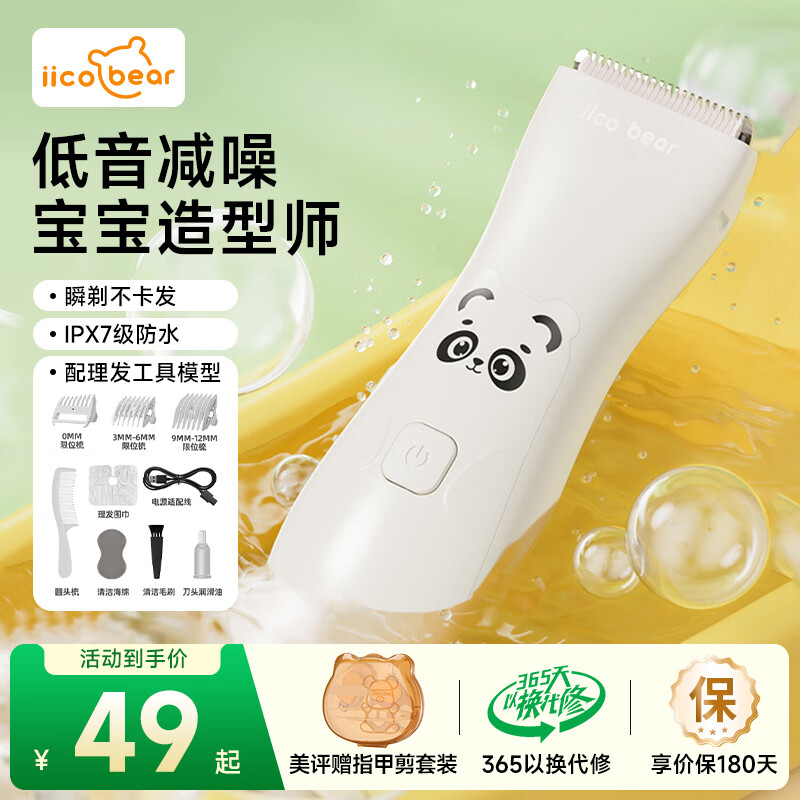 亿可熊(iicobear)婴儿理发器家用轻音电动推剪宝宝儿童理发推子剃发神器全身可水洗 白色【低音防水/送剃发礼包】