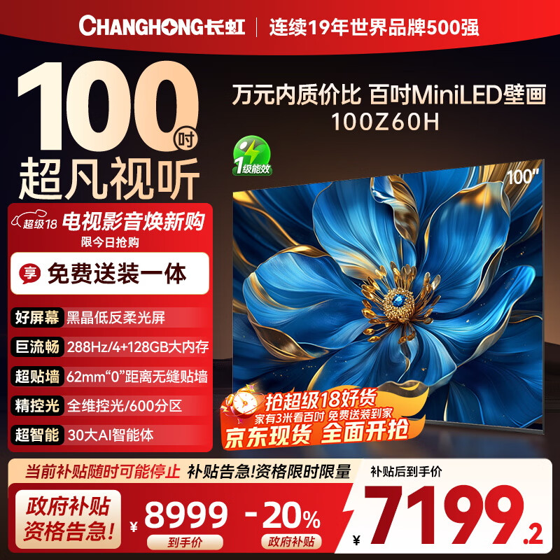 长虹欧宝丽电视 100Z60H 100英寸广角低反柔光屏Mini LED 288Hz高刷巨幕壁画电视以旧换新国家补贴20%