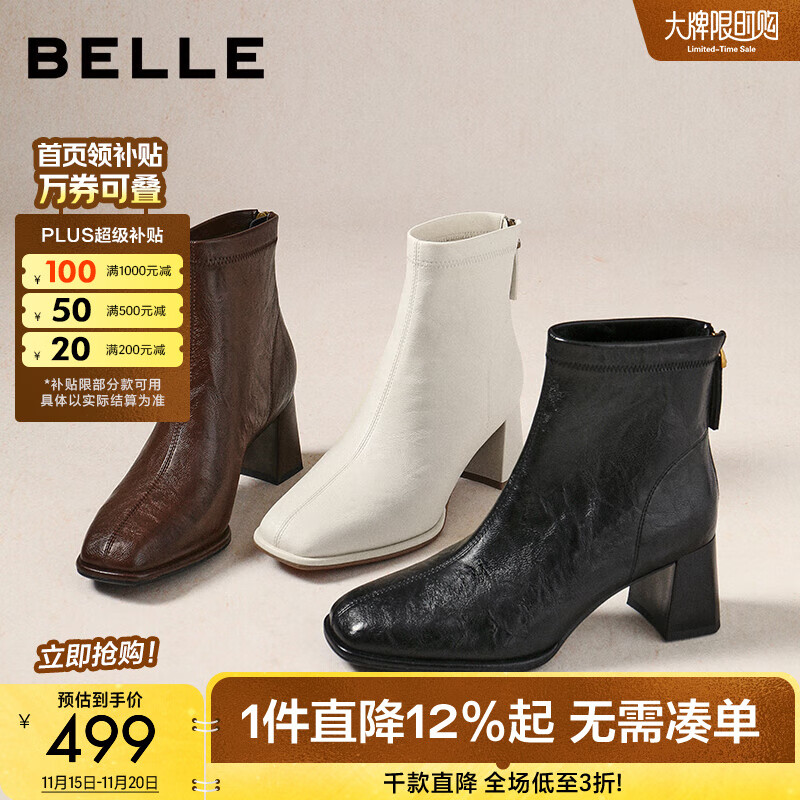 百丽(Belle)复古褶皱面时装靴女2025冬新商场同款优雅高跟短靴E5U1DDD5预售 黑色 37