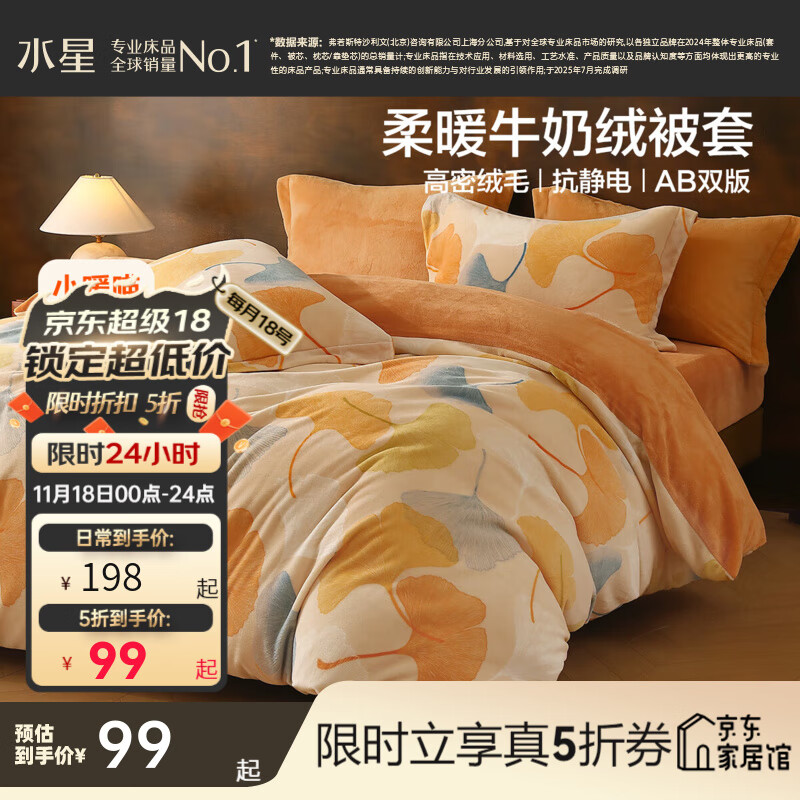 水星家纺被套单件 A类牛奶绒加厚抗静电被套 秋冬保暖宿舍暖绒被套被罩 叶梦然 (A类牛奶绒+抗静电) 200cm*230cm