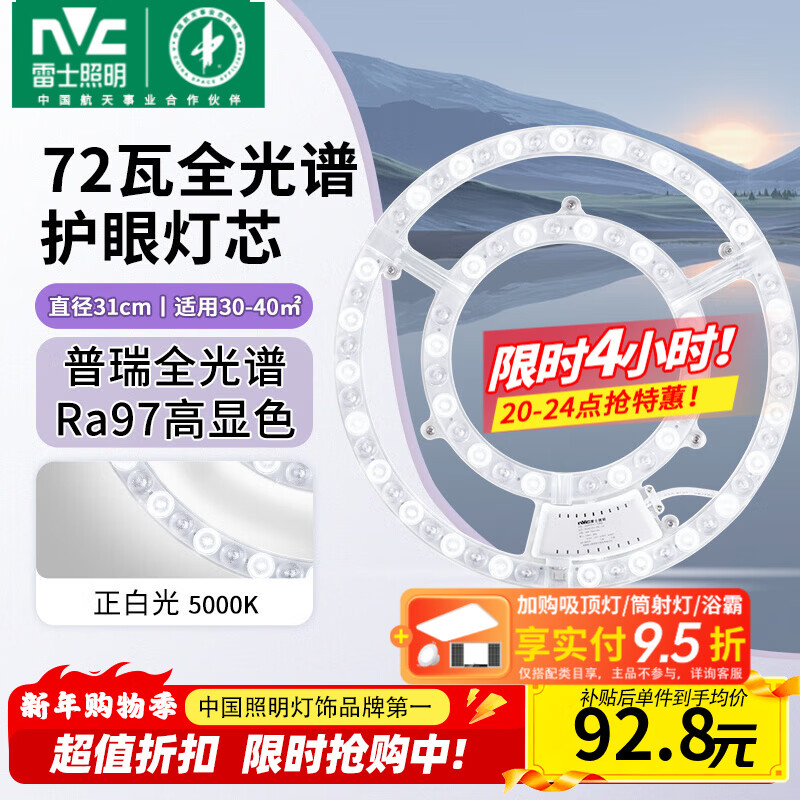 雷士(NVC)led吸顶灯芯改造灯板磁吸灯泡灯条贴片替换灯盘光源灯珠灯管 【进口普瑞全光谱】Ra97-72瓦白光/30-40㎡