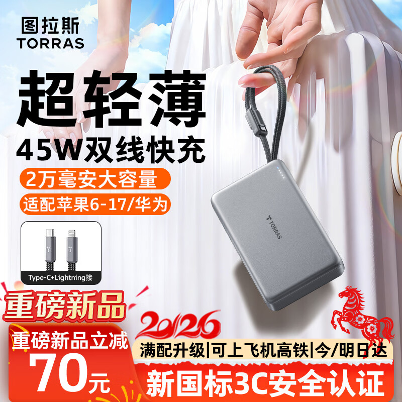 图拉斯20000毫安充电宝自带线【热销TOP1】3C认证可上飞机大容量45W小云宝快充超轻薄便携适配苹果华为 【深空灰】2万毫安丨45W双线超快充 旗舰正品丨2万毫安自带双线丨45W超快充
