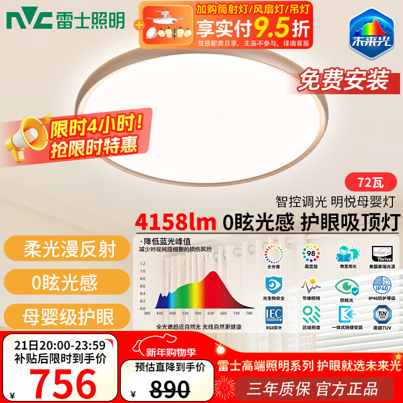雷士(NVC)未来光母婴漫反射吸顶灯全光谱护眼背光卧室灯具明悦母婴灯 72W 20㎡内适用 4158lm 母婴漫反射圆灯