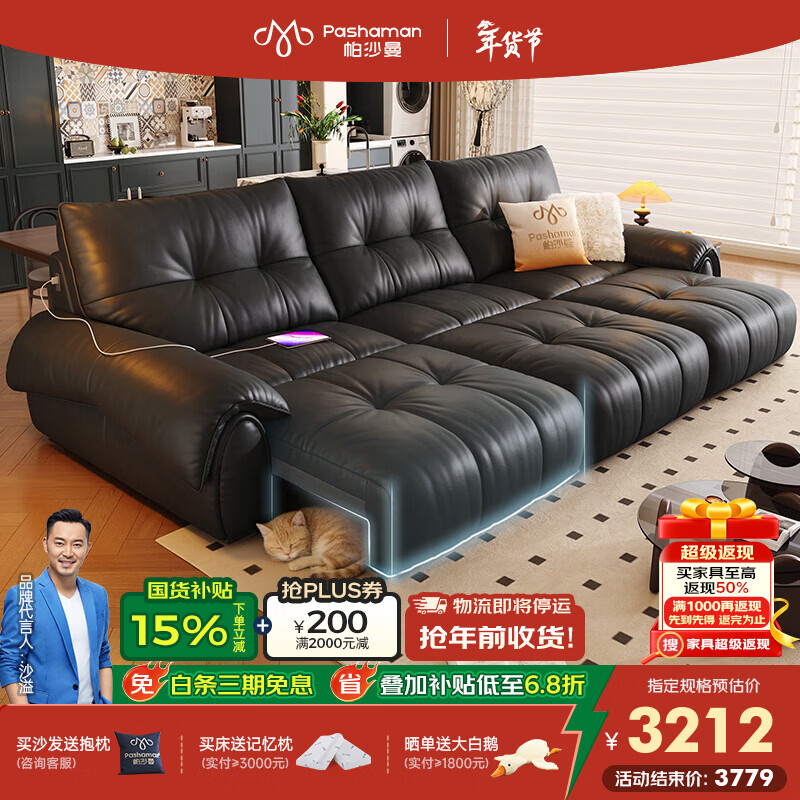 帕沙曼智能防夹功能沙发复古客厅2025新款舒适伸缩真皮电动沙发GF504-C 【单电动】2.44米双人位 【豪华版】 (轻弹棉+紫罗兰+竹炭海绵)