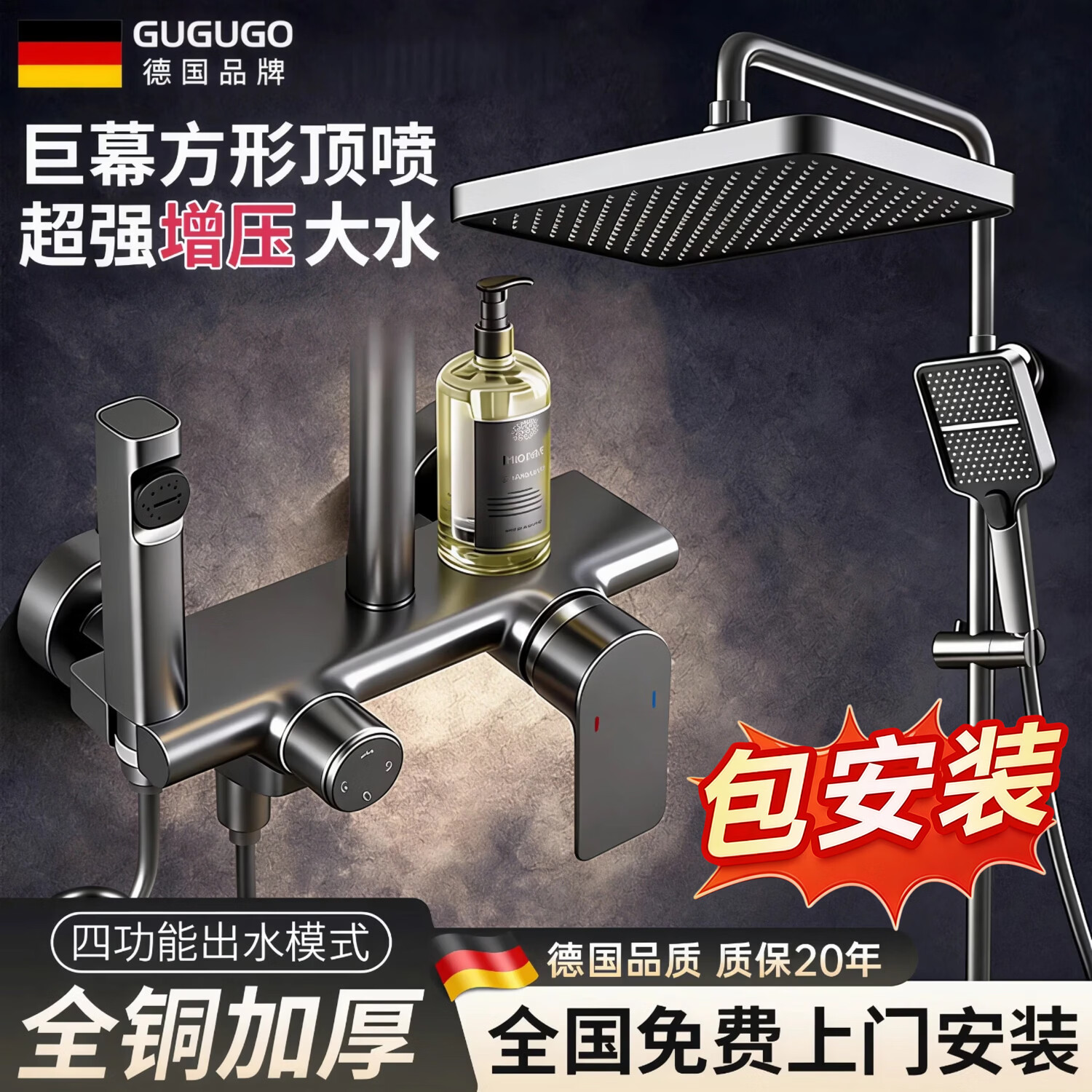 GuGuGo【德国】花洒淋浴套装全铜花洒套装一体上门安装浴室卫浴花洒全套 免费上门安装【全铜主体】方形花洒套装 免费上门安装丨巨幕增压顶喷