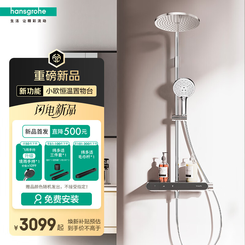 汉斯格雅(Hansgrohe)淋浴花洒“小境雨”Plus恒温置物台花洒套装【现货】 镀铬飞雨手持