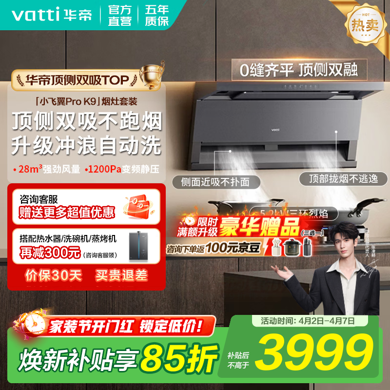华帝烟灶套装【小飞翼Pro K9】张凌赫同款顶侧双吸抽油烟机燃气灶双炉灶具28吸力家用自清洁一级能效 【联动定时70%热效套装】K9+309D 天然气