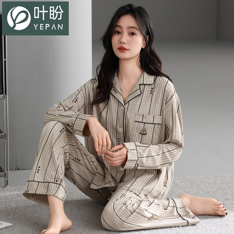 叶盼(yepan)【柔软】莱卡纯棉睡衣女士春秋季长袖开衫女款宽松大码家居服套装 64137-杏灰 M (160) :建议80-100斤穿着
