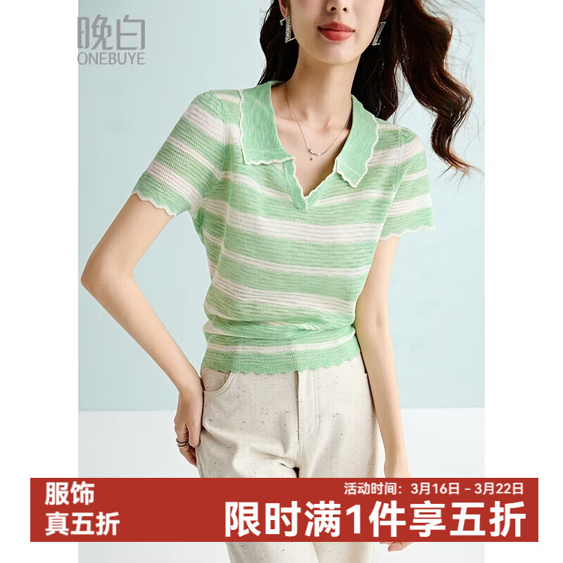 晚白【新品】2026年春款时尚条纹短袖高弹透气翻领休闲针织衫女 条纹 S