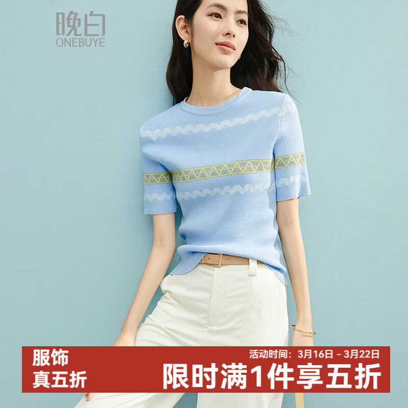 晚白【新品】2026年春款时尚圆领短袖清新印花修身舒适针织衫女 蓝色 L