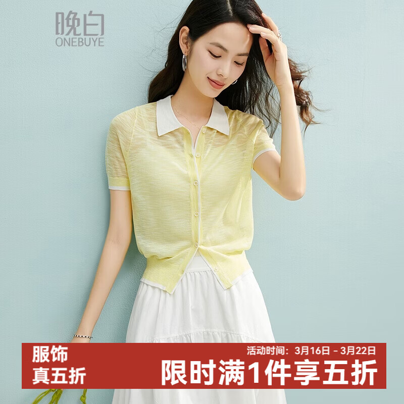 晚白【新品】2026年春款时尚撞色翻领上衣轻薄弹力休闲针织开衫女 黄色 S