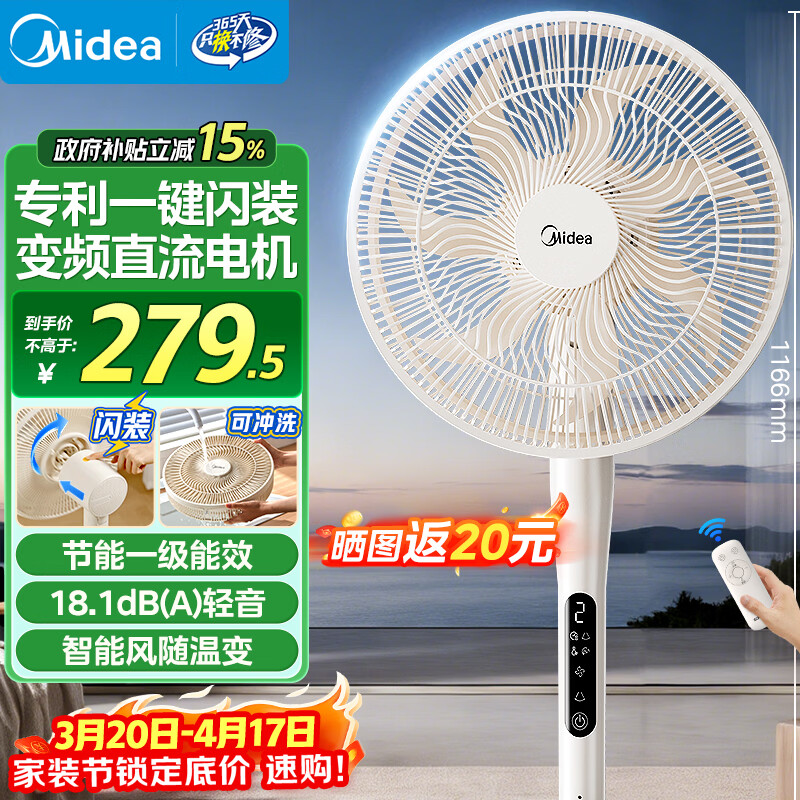 美的(Midea)【一键闪装】电风扇 家用立式一级能效变频直流落地扇卧室客厅大风力轻音低噪小型风扇 SDJ30BM