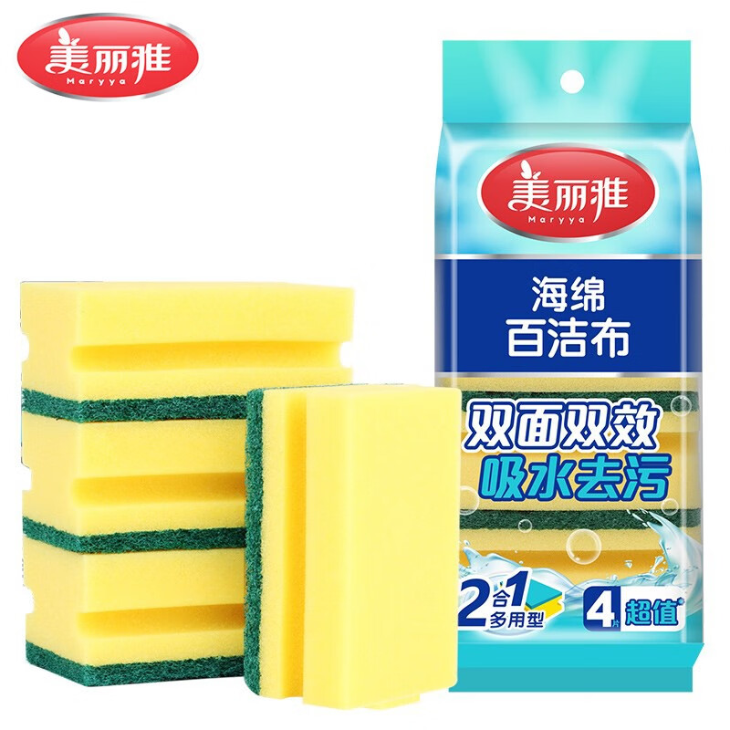 美丽雅海绵百洁布 多用途吸水抹布厨房洗碗布去污强吸油性抹布 U型4片