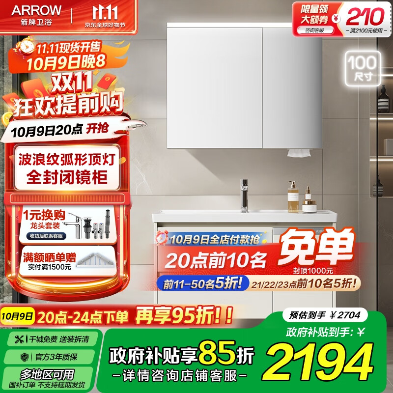 箭牌(ARROW)若曦系列美妆收纳现代智能镜柜洗脸盆洗漱台收纳柜浴室柜组合 智能弧形顶灯100cm,5天发