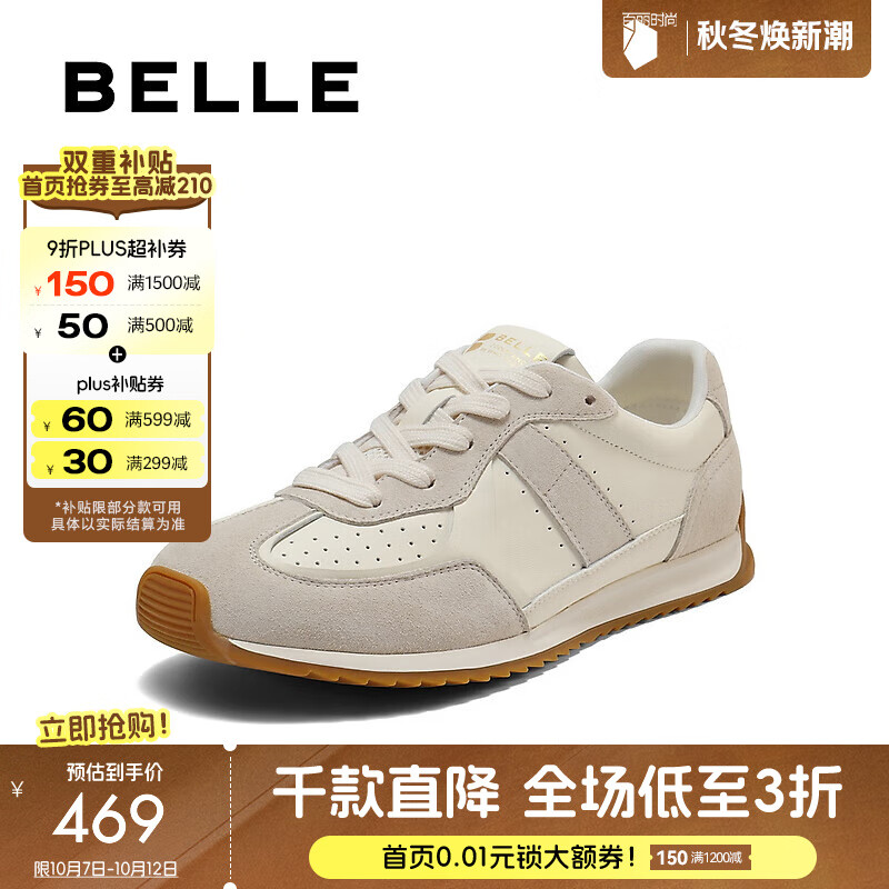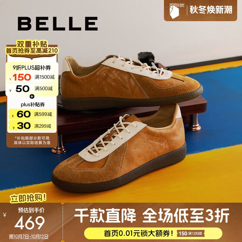 百丽(Belle)复古牛皮撞色德训鞋女2025秋新舒适薄底休闲板鞋BBSC2CM5 棕色 37