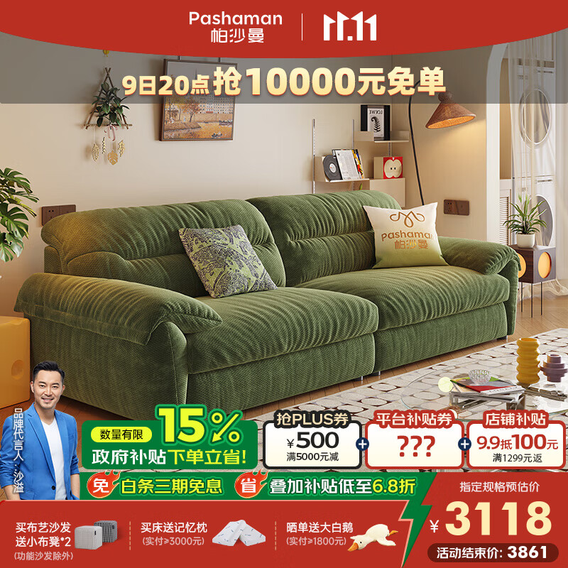 帕沙曼可拆洗布艺沙发小户型客厅简约现代绿色雪尼尔沙发宽坐深 2875ZF 2.5米多人位【可拆洗设计】 雪尼尔【豪华版】 羽绒+紫罗兰+记忆棉+竹炭海绵