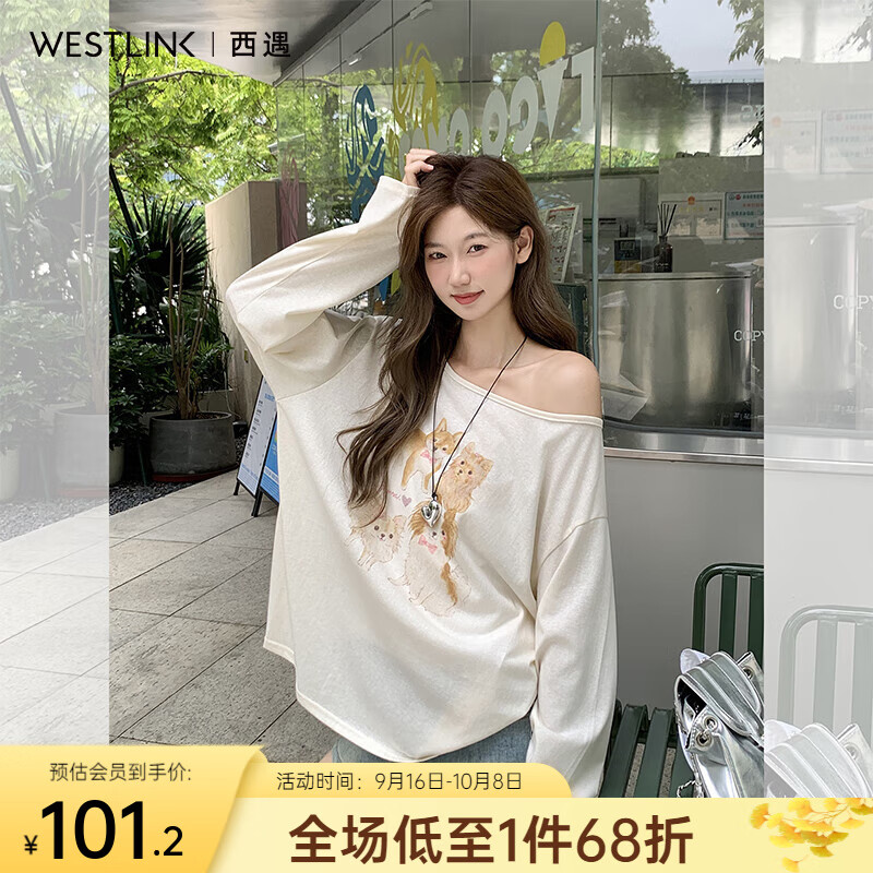 西遇露肩薄款长袖T恤女2025年秋季新款慵懒风印花宽松显瘦上衣 杏色 (预售15天) M (160)
