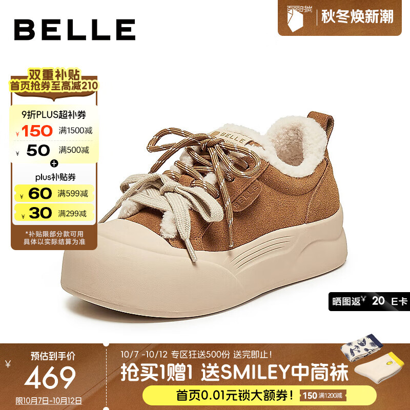 百丽(Belle)复古厚底增高毛毛鞋女2025冬新加绒保暖休闲板鞋B2842DM5 棕色 39