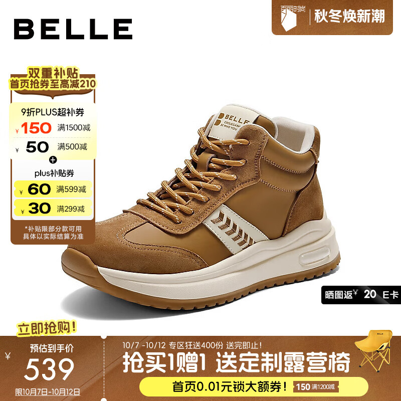 百丽(Belle)撞色高帮鞋女2025冬新商场同款舒适厚底增高休闲鞋E5V1DDD5 棕色 37