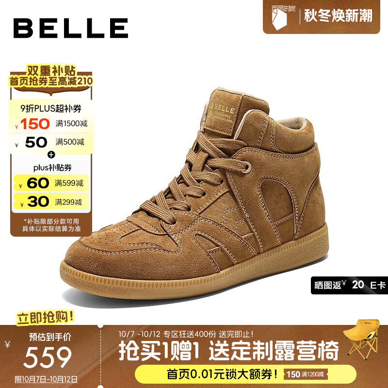 百丽(Belle)复古百搭高帮鞋女2025冬新商场同款舒适薄底休闲鞋E8H1DDD5 棕色 36