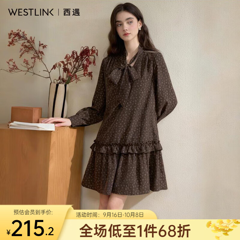 西遇美拉德法式复古碎花连衣裙女2025秋季蝴蝶结显瘦长袖中长裙 咖色 S (155)